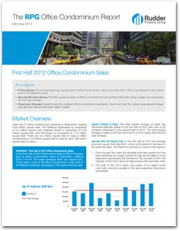 This report provides an overview of the Manhattan office condominium sales market in the first half of 2012 and it includes historical sales data, an in-depth look at notable office condominium sales in each submarket, and the citywide office condominium availability rates. In addition, this report features an interview with Doug Lasdon, the executive director of the Urban Justice Center. Doug discusses the successes his organization has had in the office condominium market.